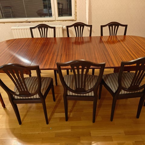 Hyväkuntoinen, hieno, puinen ruokailuryhmä jatkopalalla (39 cm). Siistit puiset 6 tuolia sisältyvät hintaan.