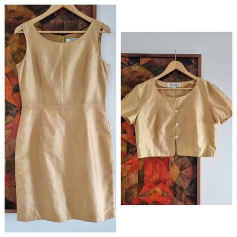 Kultakeltainen mekko ja takki, 100% silkkiä, Stockmann OVH.3000€
