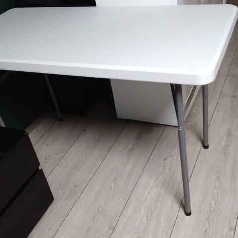 Tarpeettomana siistikuntoinen, valkoinen puolipyöreä pöytä taitavalla lisäosalla.
