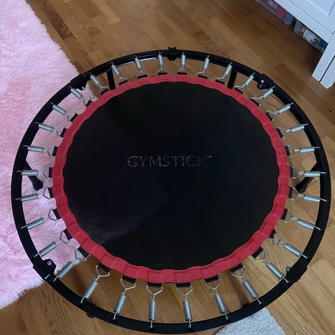 Gymstick trampoliini, pienikokoinen, musta ja punainen väri. Käytetty sisätiloissa harjoitteluun ja kuntoiluun. Varustettu tukevilla jaloilla ja kestävästä materiaalista valmistettu hyppypinta. Halkaisija 100cm.