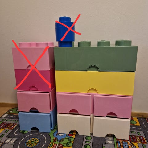 LEGO-lipasto, jossa on kaksi erillistä laatikostoa. Sopii kaikenikäisille lapsille lelujen säilytykseen. Kunto on hyvä, mutta punaisesta laatikosta on lähtenyt takaseinä irti.