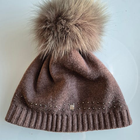 Warm lined winter hat with faux fur pom-pom.