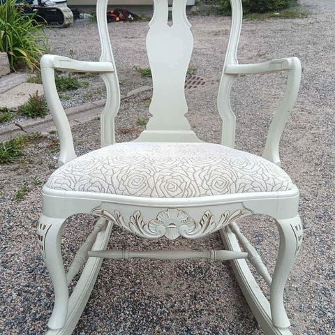 Siistikuntoinen keinutuoli, ei kulumisen jälkiä. Istuin päälliset ehjät ja hyvässä kunnossa. Jouset hyväkuntoiset. Tuoli on tukeva ja mukava istuttava, päälliset pehmeät.