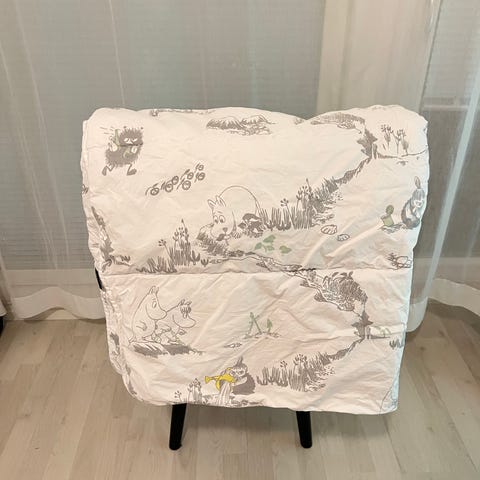Siisti, mutta käytetty junior koon petivaatepaketti: pussilakanasettejä ja Muumi juniorpeitto ja tyyny.