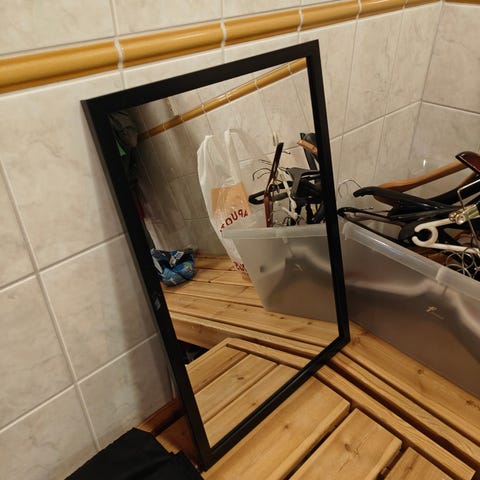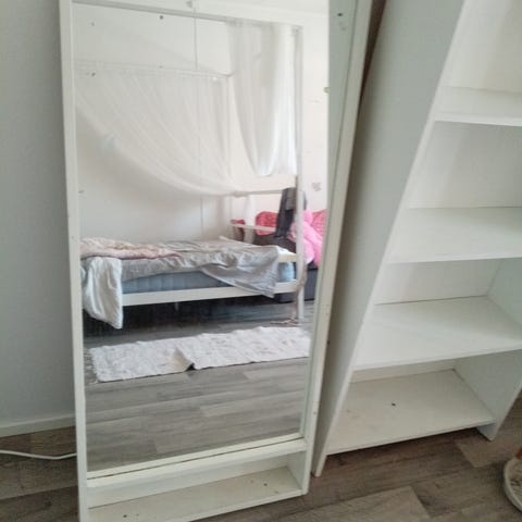 Annetaan Ikean Nissendal peili. Kulmasta kehys mennyt rikki nostaessa peiliä. Peilin pinnassa jokunen naarmu, mutta muutoin vielä toimiva. En tiedä pystyisikö tämän korjata esim liimalla. Annetaan muuton tieltä pois, haku Käräjätörmästä Tohlopista.