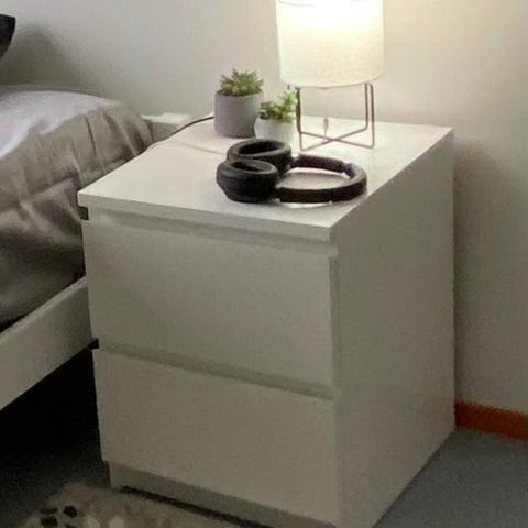 Valkoinen yöpöytä pienellä vetolaatikolla. Mahdollisesti Ikea, en ole aivan varma. Käytönjälkeä näkyy, mutta yleisilme siisti. Vetolaatikko välillä jumittaa, en tiedä saisiko kiskoja säätämällä toimivammaksi tai öljyämällä.