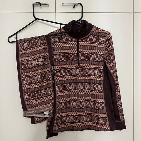 Hyväkuntoiset ja ehjät kerrastohousut. Pääkangas polyesteri 91%, elastaani 9%.