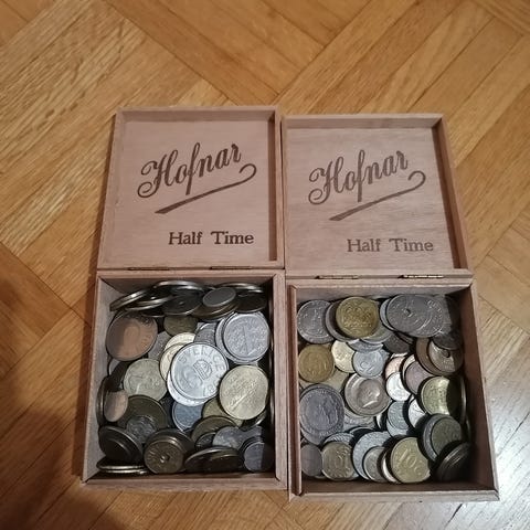 Erä keräilyrahoja. Vanhimmat kolikot on vuosilta 1900-1959. Niiden vuosiluvut ja arvot näkyy kuvan listassa.