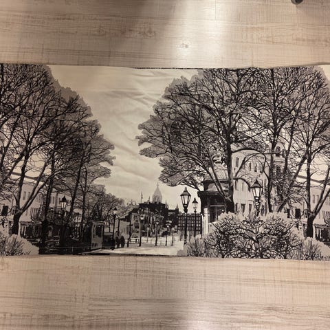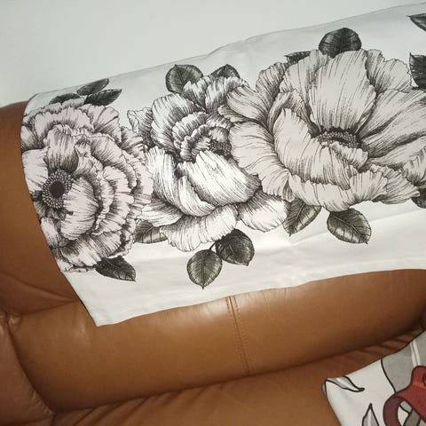 Vallilan Alma verhokappa, erittäin hyvässä kunnossa. Kukissa hiukan sinertävää sävyä ja lehdissä vihertävää.