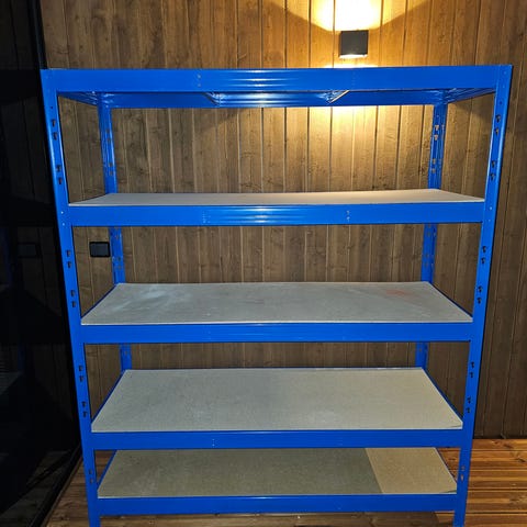 Myydään kuvien mukaista tukevaa hyllyä. Hyllyn korkeus 253 cm ja syvyys 60 cm. Yhden välin leveys 127 cm. Hyllyä saatavilla kahden välin tai kolmen välin kokoonpanoissa ja hyllyjä tulee mukaa 6 kpl/ väli. Hyllyt pystyy kokoamaan haluamaansa jakoon. Renkaita varten poistin hyllyn keskimmäisen tuen.