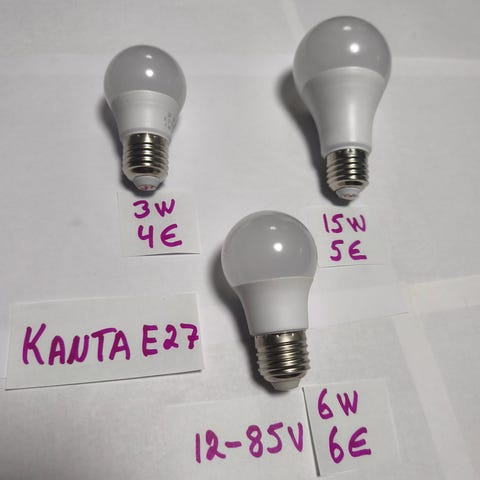 Kuvanmukainen setti LED-polttimoita. Osa käyttämättömiä ja osa kokeiltuja. Suurin osa himmennettäviä.