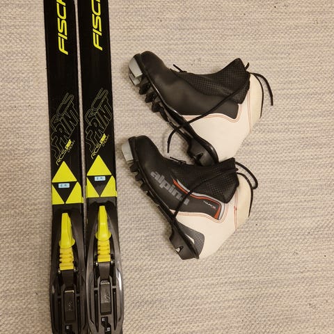Fischer sprint crown 110cm lasten pitopohja sukset ja ski go touring 70cm sauvat. Lisäksi suksiin sopivat 26 koon alpina monot.