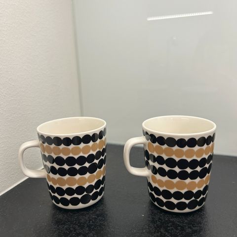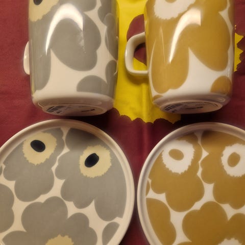 Marimekko kahvikuppi ja lautanen, joissa mustasininen ja mustapunainen kuviollinen design. Sarjaan kuuluu kaksi kuppia ja kaksi lautasta.