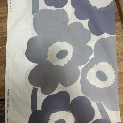 Puuvillasatiinista valmistettu Unikko-pöytäliina. Liinassa hopeanväriset pigmenttipainetut yksityiskohdat. Väri beige-valkoinen.