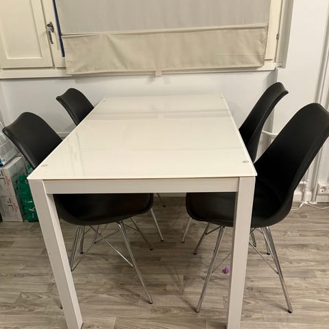 Elämää nähnyt täysipuinen ruokapöytä, jossa lasipaneelit (irroitettavat) sekä samaan sarjaan kuuluvat tuolit. Pienellä fiksauksella, tästä saisi upean kokonaisuuden.