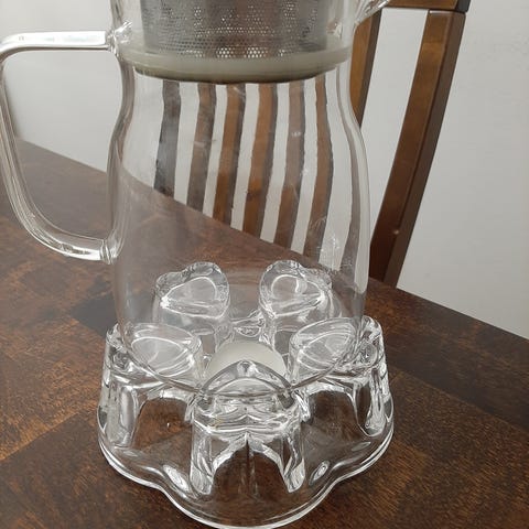 Hyväkuntoinen jonkin verran käytönjälkiä, Pyrex lasinen teen haudutuspannu, vetoisuus puoli litraa, käy irtoteelle / teepusseille, mahd postikulut ostajalle