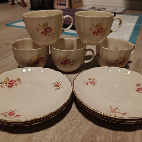 Kaunis ja ajaton kahviastiasto / teekupit, yhteensä 9 kuppia ja aluslautaset.