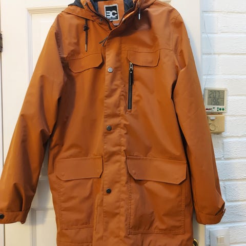 Valkoinen, hupullinen paksu talvitakki. Siisti ja ehjä. Todella lämmin. Miesten S koko, menee myös naiselle.