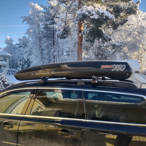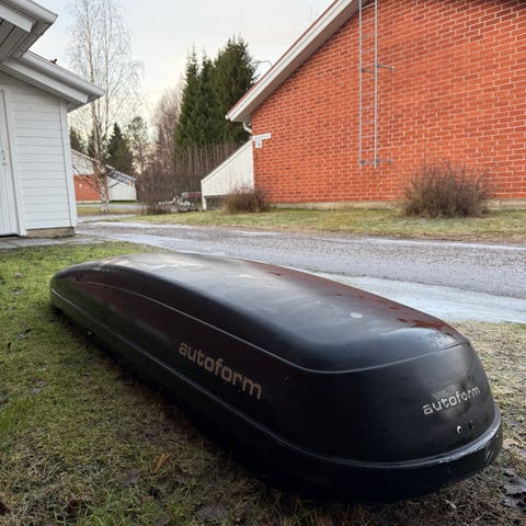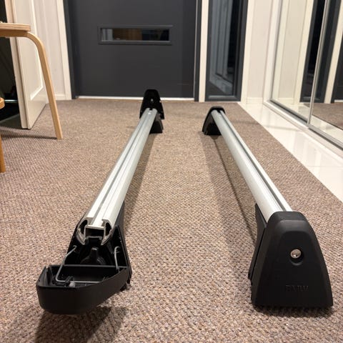 Täysin ehjät Autoform m22 kiiltävä valkoinen pika kiinnityksellä oleva Suksiboksi BMW:n alkuperäisillä taakkatelineillä.