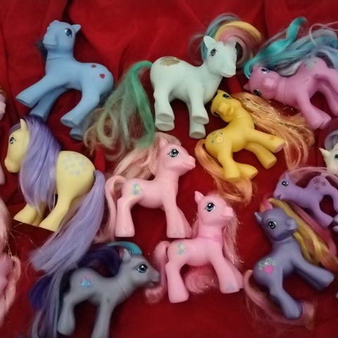 My Little Pony lasten lelut, useita erivärisiä ja -kokoisia ponihahmoja.