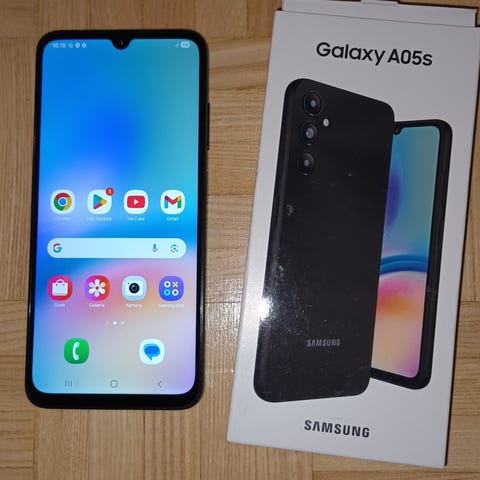 Samsung Galaxy A -sarja älypuhelin, 128 GB tallennusmuistilla, musta väri. Puhelimessa on 5G-yhteys ja mukana latauskaapeli.