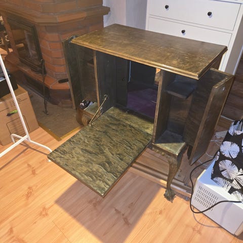 Mitat: Korkeus 93cm (kansi avattuna 118cm), leveys 102cm ja syvyys 49cm. Kannen alla oleva vasen kaappi on 23cm syvä ja oikea kaaappi on 35cm syvä.