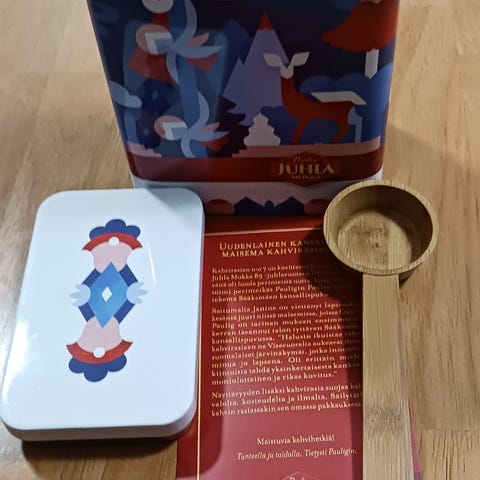 Lotta Niemisen suunnittelema Pauligin kahvipurki lusikka ja liite mukana