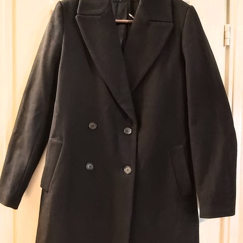 Kaunis ja uudenveroinen Zaran musta villakangastakki muhkealla tekoturkishupulla. Yksityiskohdat hopean väriset. Koko S.