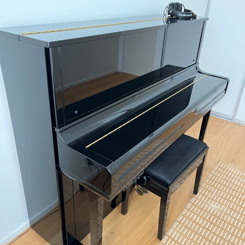 Musta Yamahan transacoustic-tekniikalla varustettu pystypiano. Ostettu kaksi vuotta sitten uutena F-musiikista, kuitit ja ohjekirjat tallessa. Hyvin pidetty ja säännöllisesti viritetty.