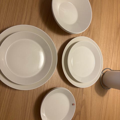 Iittala astiasto, jossa on punaiset lautaset ja kulhot. Määrät: 6kpl isoja syviä lautasia, 6kpl pieniä "muro"kulhoja, 5kpl pieniä lautasia (yhdessä särö, kts. kuva). Löytyy myös 6kpl samanvärisiä keskikokoisia lautasia.