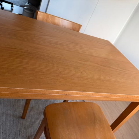 Ikean varhaista mallistoa, täyspuinen tukeva ruokailupöytä, joka jatkettavissa kahdella 42,5 cm jatkopalalla.