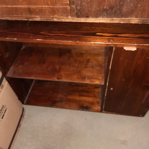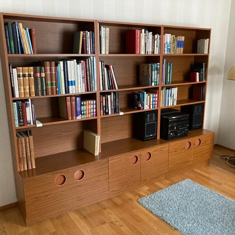 Suoraan käytöstä ehjä 60-luvun kirjahylly. Naarmuja jonkin verran, onnistuu varmaan fiksaamaan jollain aineella. Yritin saada näkymään kuvissa. Kaapin ovet toimii, myös lukko. Hyllypaperin saa kaupan päälle :)