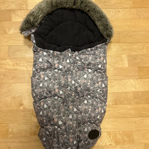 Petite Cherie merkkinen kaukalopussi. Harmaa, jossa pieniä lintu/kukkakuvioita. Kaunis karvareunus hupussa.
