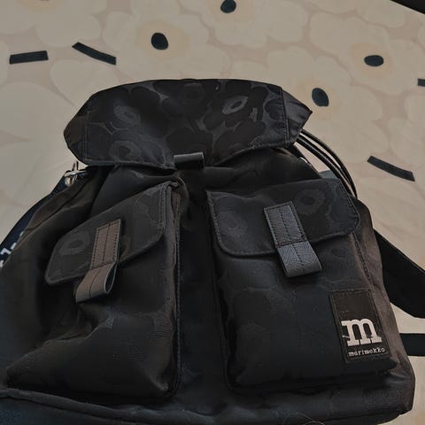 Marimekko Everything Backpack L Unikko reppu on valmistettu kierrätetystä jacquard-kankaasta, jossa on Unikko-kuosi. Repun mitat ovat leveys 28 cm, korkeus 36 cm ja syvyys 18 cm. Reppu on musta. Siinä on kiristysnyörillä suljettava suuaukko, magneettinapilla kiinnittyvä kansi sekä etutaskut magneettinapeilla. Reppu sopii sekä arki- että vapaa-ajan käyttöön unisex-mallina. Säädettävissä olkahihnoissa on pehmusteet. Toisella sivulla on yksi pitkä vetoketjutasku ja toisella Marimekko-avaimenperä. Repun sisällä on kannettavalle tietokoneelle sopiva iso tasku. Selkäpaneeli on pehmustettu. Laukussa on nahkaisia yksityiskohtia.