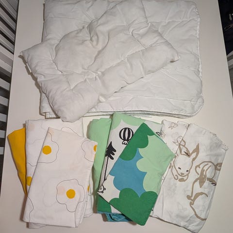 Kuvateksteistä löytyvät pussilakanoiden ja tyynyliinojen tarkemmat kokotiedot. Merkkeinä Finlayson, Little roomies ja Kronborg.