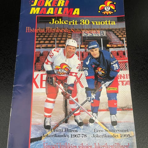 Jokerit maila, kunto: ainakin hyvä. Tarran liima lavan ja varren kohdalla on kuivunut jonkin verran, tarra on hieman löysänä siinä. Muu on kovaa printtiä. Ollut seinällä, ei pelattu mitään polvilätkää tai mutta. * Hakusanat: Jokerit 1992, Jääkiekko. Postitus ok.