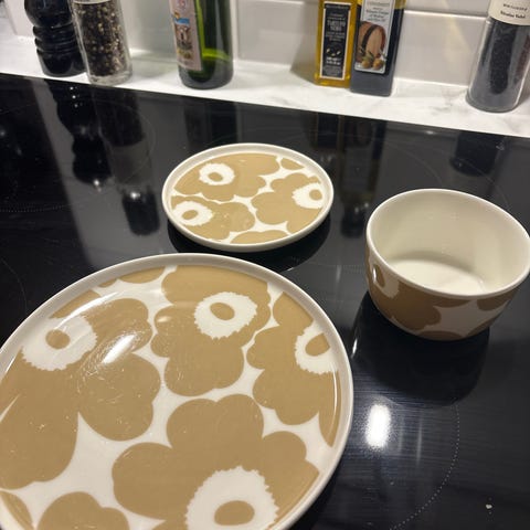 Ostetaan Marimekon Kaksoset sarjan lautanen ja kulho, värinä beige tai sininen