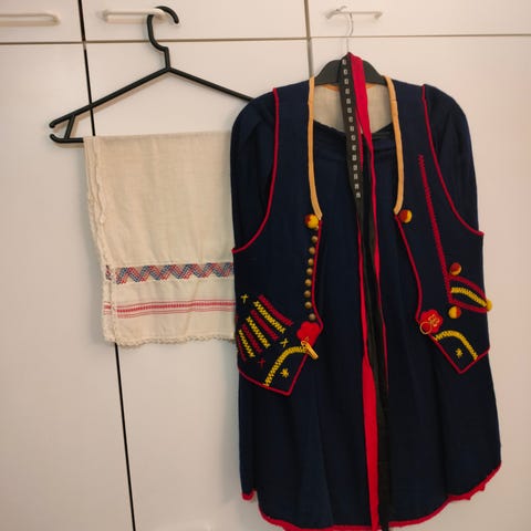 Naisten kansallispuku, hyvässä kunnossa. Settiin kuuluu hame, liivi, paita, esiliina ja nauhapanta. Puku on ollut säilytyksessä käyttämättömänä pitkään, joten on ryppyinen.