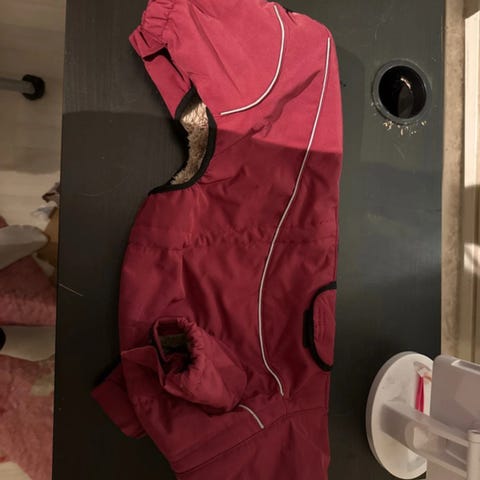 Myydään pari kertaa sovitettu koiran talvipuku karvavuorella. Seissyt kaapissa jo kauan, kun ei mahtunut vanhemmalle koiralle ja vihdoin kun pakkaset tulivat, pentu myös kasvanut melkein ulos tästä. Löytyy selästä reikä valjaille (kuva). Nouto Kuninkaantammi tai toridiili.