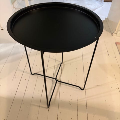 Musta sohvapöytä, painava ja tukeva rauta jalka, ei heilu eikä huoju.