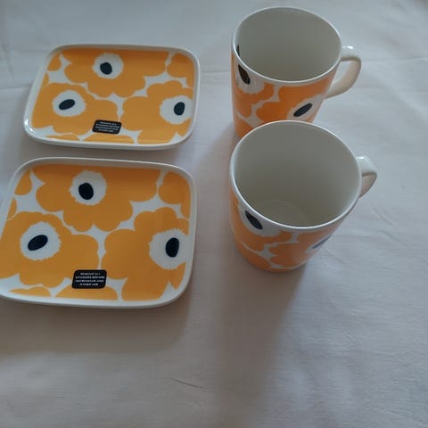 Myynnissä 3 pientä Unikko-kulhoa ja yksi Unikko-muki, kaikki tarrallisia ja 2,5dl. Yhteishinta kaikille on 106e.