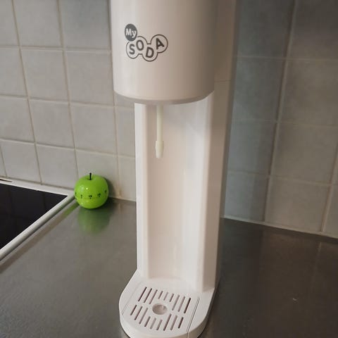 Valkoinen MySoda hiilihapotuslaite. Mukana tyhjä hiilidioksidipatruuna ja uudelleenkäytettävä pullo josta on mennyt päiväys (07/2022).