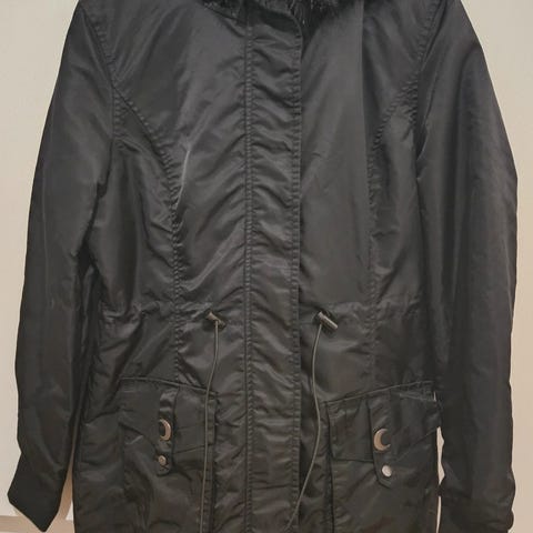 Hupun ulkopuoli mustaa samettia, sisäpuoli tekoturkista, reunus pitempikarvainen tekoturkis.