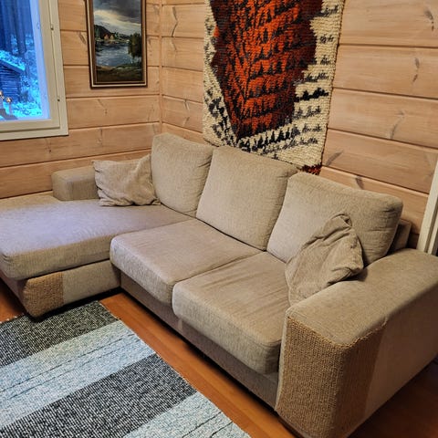 Annetaan pois valtavan kokoinen divaanisohva.Maskun Bellus merkki. Mukana valtava määrä koiran karvaa,mutta ei muuten näkyviä tahroja. Painaa todella paljon,omat kantajat mukaan.