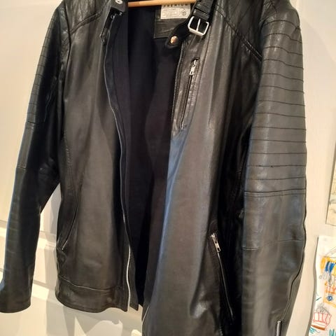 Jack & Jones nahkatakki miehille, koko XL, musta väri. Takki on valmistettu keinonahkasta (polyesteriä). Kuvassa oleva henkilö 193cm eli takki menee pidemmällekin tyypille.