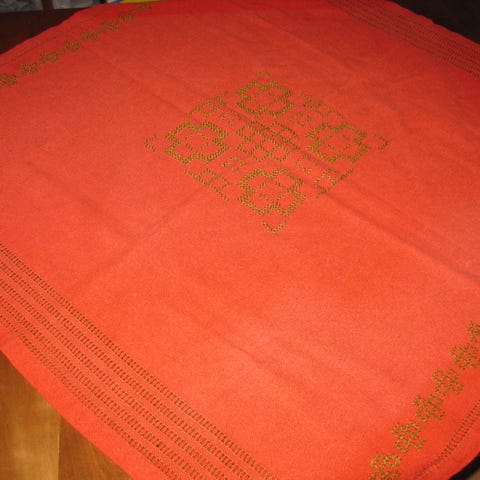 50-luvulta peräisin olevat, käsin kirjaillut pöytäliina (n 68 x 68 cm) ja pyyhetelineen "peite" (n 83 x 57 cm), puuvillaa ja pitsireunat. Hieman elämää nähneitä (kuvat), pistemäisiä tahroja muutama, kengät pyyhepeitteessä jo kuluneet, yksi pöytäliinan kulma hieman rispaantunut. Pyyhepeitteessä tankokuja ylhäällä. Myydään yhdessä. Toriviesti, posti tai ärräpussi, nouto