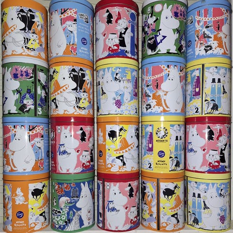 Kahdeksan pientä pyöreää peltipurkkia Muumi Aku Ankka