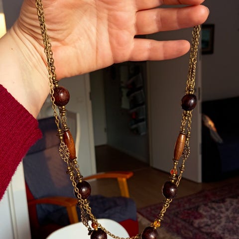 Metalli-, akryyli- ja puuhelmet, ketjun väri pronssi
