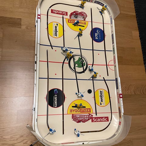 Stiga NHL pöytäjääkiekko peli, jossa on sininen pelialusta, punaiset maalit ja valkoiset reunat. Peli sisältää pelaajat, jotka on sijoitettu pelialustalle, ja mukana on alkuperäinen laatikko. Soveltuu pöytäpeliksi jääkiekkofaneille.