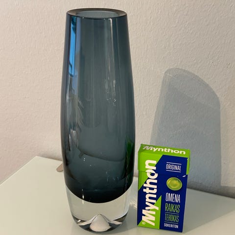 1. Sininen Lappi maljakko. Suunnittelija Erkki Vesanto. Maljakko on täydellisen ehjä ja hyvä. I -tarrakin on jäljellä, Iittala. 40 euroa